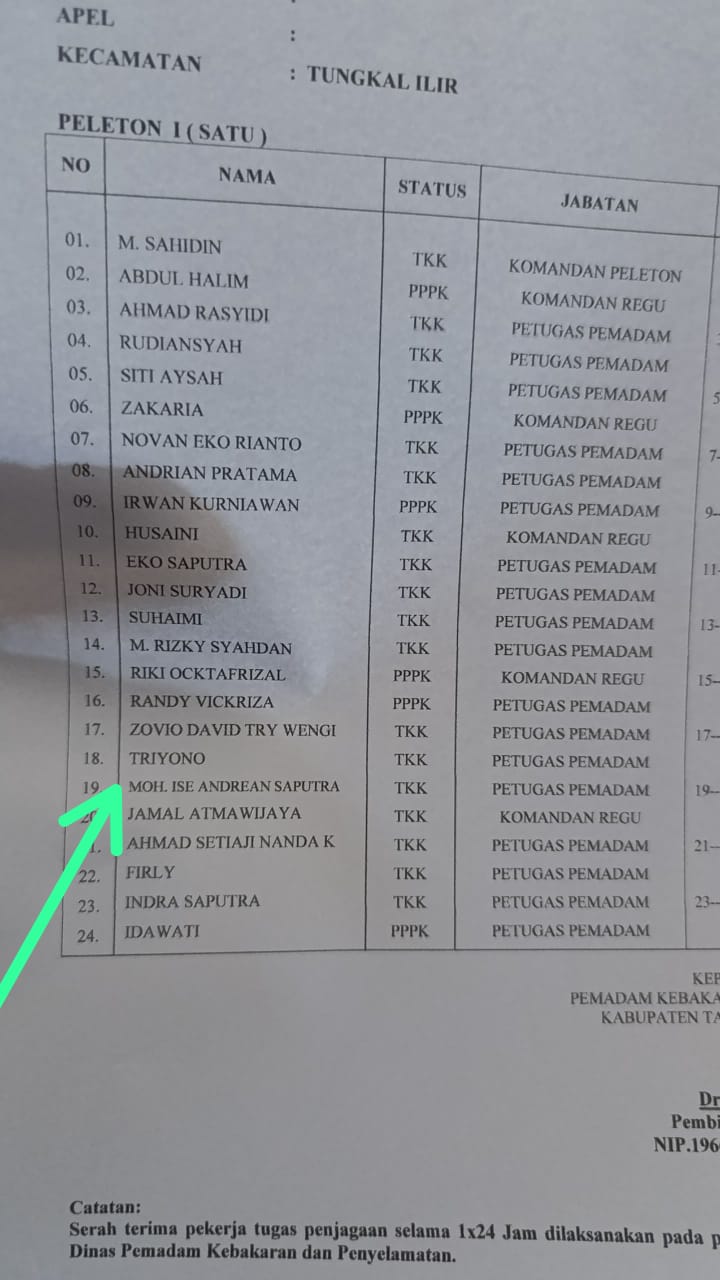 Dalam absen yang diterima searah.co Moh Ise Andrean Saputra masuk dalam peleton 1 atau regu 1 berjumlah 24 orang jabatan sebagai pemadam dan berstatus sebagai tenaga kerja kontrak.