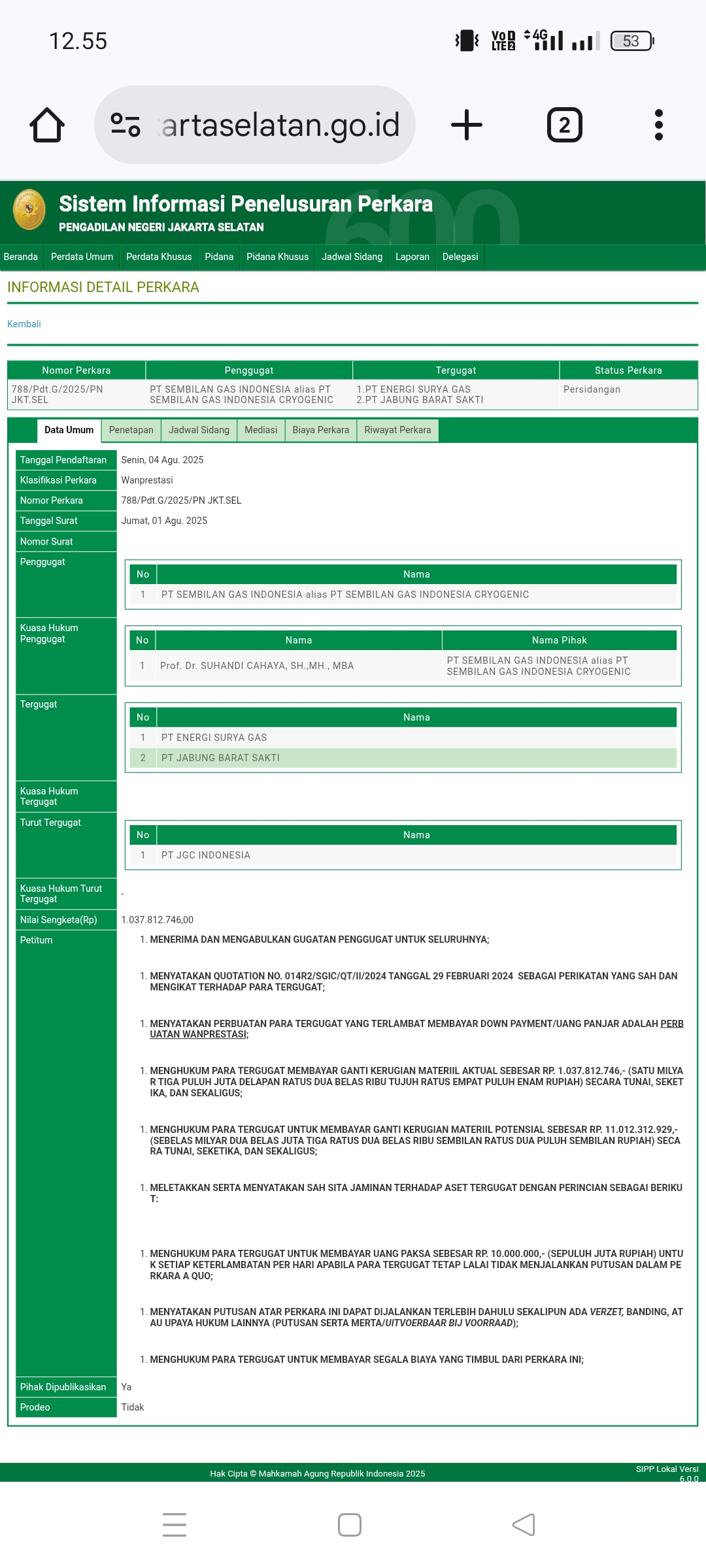 Pendaftaran perkara tersebut dilakukan, Senin 4 Agustus 2025 terkait dengan wanprestasi dengan nomor gugatan 788/Pdt.G/2025/PN JKT.SEL dengan tanggal surat 1 Agustus 2025.