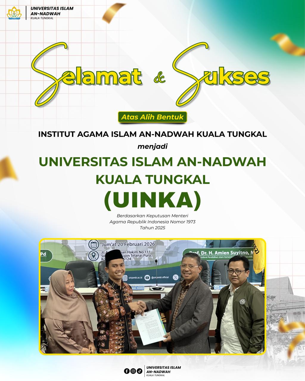“Berdasarkan Keputusan Menteri Agama Republik Indonesia Nomor 1973 Tahun 2025 Tentang Izin Perubahan Bentuk Institut Agama Islam An-Nadwah Kuala Tungkal menjadi Universitas Islam An-Nadwah Kuala Tungkal.” Tandasnya.