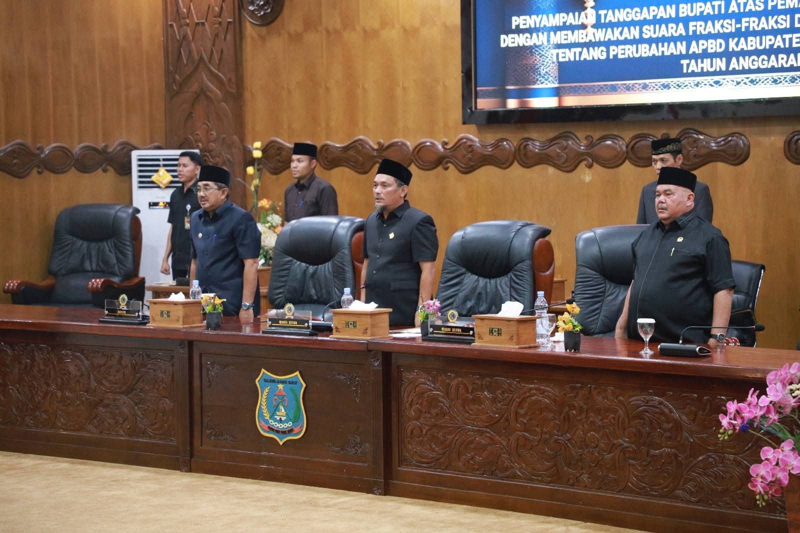 “Saya yakin dan percaya bahwa yang disampaikan Fraksi-Fraksi terhadap Nota Keuangan dan Ranperda Perubahan APBD Tahun Anggaran 2025 adalah upaya untuk penyempurnaan terhadap implementasi program dan kegiatan yang direncanakan oleh Pemerintah Daerah dalam rangka untuk meningkatkan kesejahteraan masyarakat. Namun demikian manakala masih ada hal-hal yang belum terjawab dengan jelas dalam tanggapan ini, Pemerintah Daerah dengan segala kerendahan hati senantiasa menyediakan waktu yang cukup bagi dewan pada saat rapat pembahasan antara Badan Anggaran DPRD dengan Tim Anggaran Pemerintah Daerah dan OPD terkait”, ungkap Bupati.