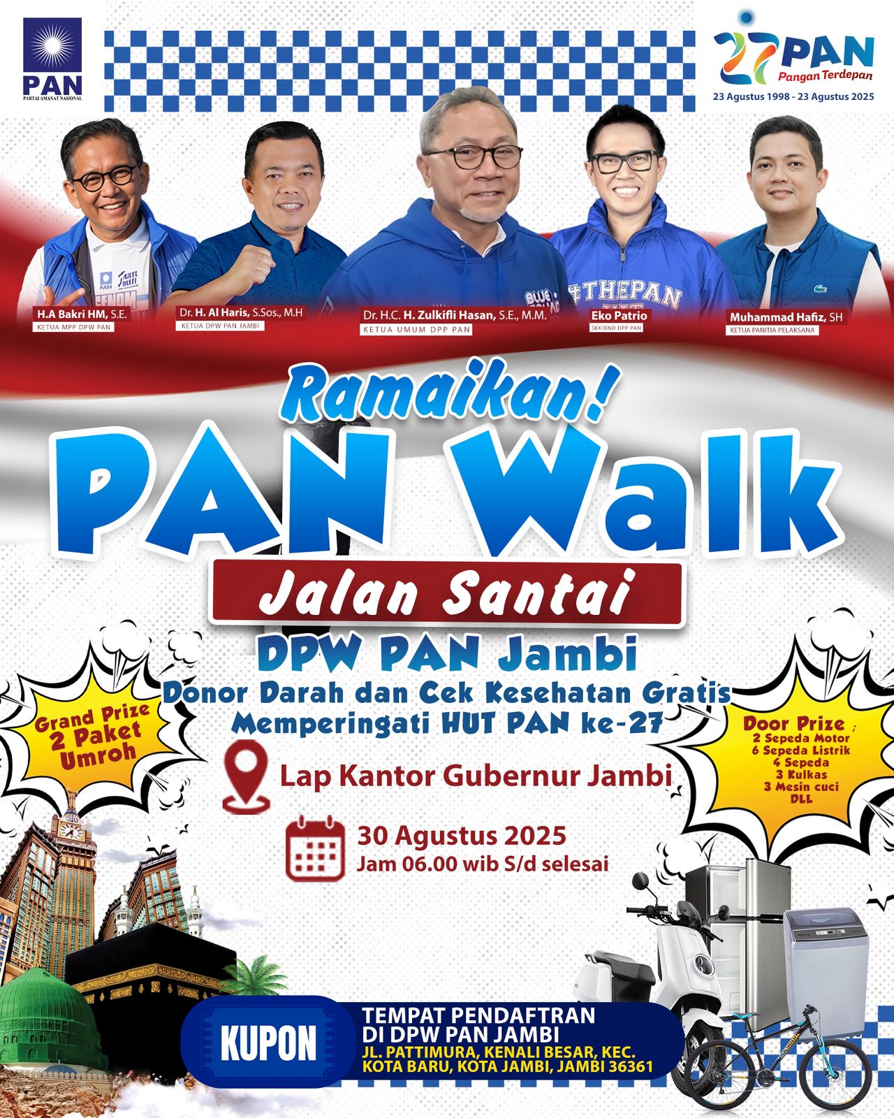 SEARAH.CO – Jalan santai (PAN walk) yang akan dilaksanakan DPW PAN Provinsi Jambi dalam rangka HUT ke-27 PAN pada Sabtu (30/8/2025) ditunda sementara.