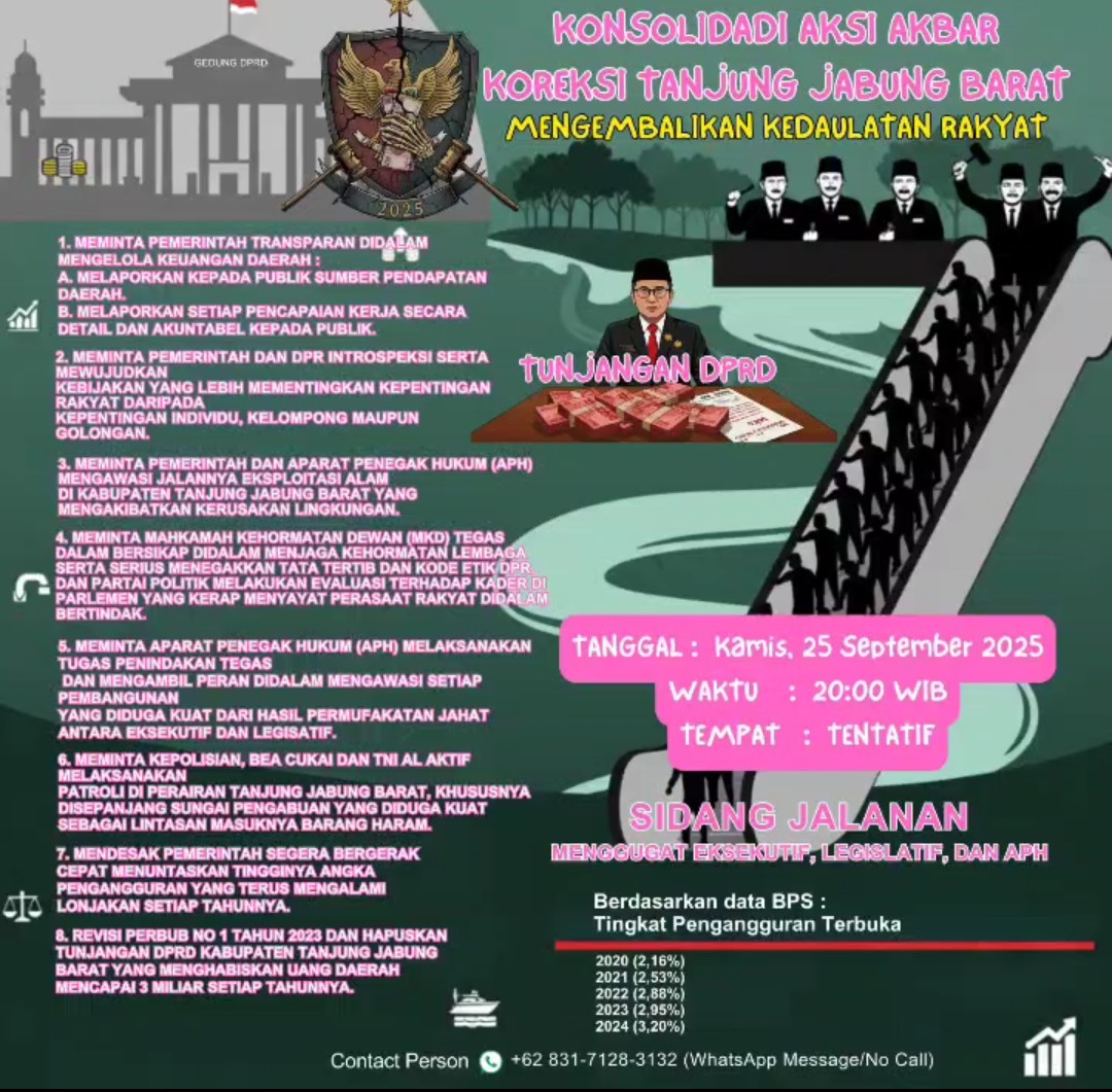 SEARAH.CO — Inilah 8 tuntutan konsolidasi aksi Akbar Koreksi Tanjung Jabung Barat (Taniabbar), mengembalikan kedaulatan rakyat.