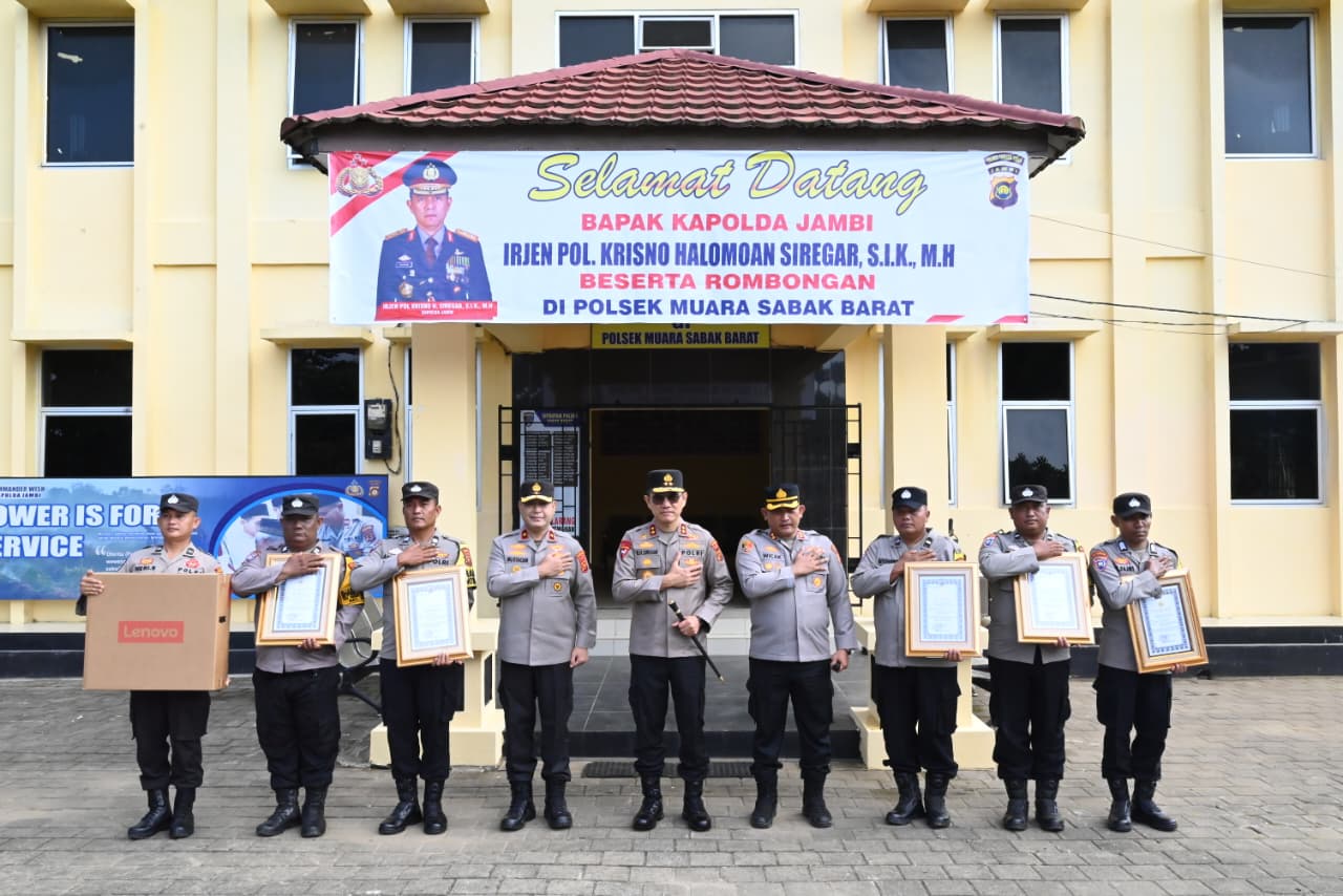 SEARAH.CO — Kapolda Jambi Irjen Pol. Krisno H. Siregar, memberikan penghargaan kepada sejumlah personel Bhabinkamtibmas berprestasi serta menyerahkan sarana dan prasarana pelayanan masyarakat di Polsek Sabak Barat, Sabtu (27/9/2025).