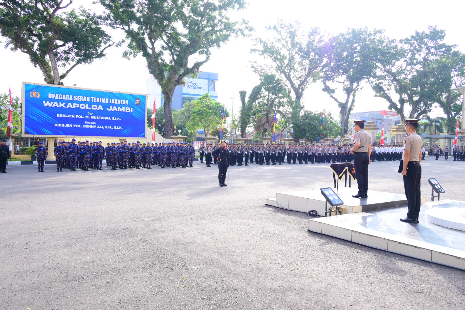 Dalam upacara tersebut, Brigjen Pol. M. Mustaqim, secara resmi menyerahkan jabatan Wakapolda Jambi kepada Brigjen Pol. B. Ali. Prosesi berlangsung sesuai tata upacara kepolisian, mulai dari penghormatan pasukan, pembacaan Keputusan Kapolri, penanggalan dan penyematan tanda pangkat serta tanda jabatan, hingga pengambilan sumpah jabatan yang dipandu oleh Inspektur Upacara.