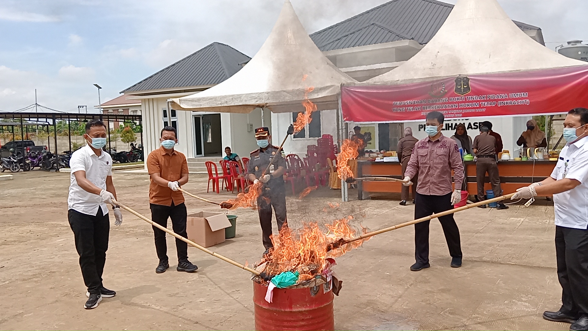 Barang bukti yang dimusnahkan atas sebanyak 145 perkara yang terdiri dari tindak kejahatan penyalahgunaan narkotika jenis sabu sabu, ganja, ekstasi, serta barang bukti lainnya berupa kejahatan pencurian, pembunuhan, pencabulan, pembakaran hutan hingga KDRT.