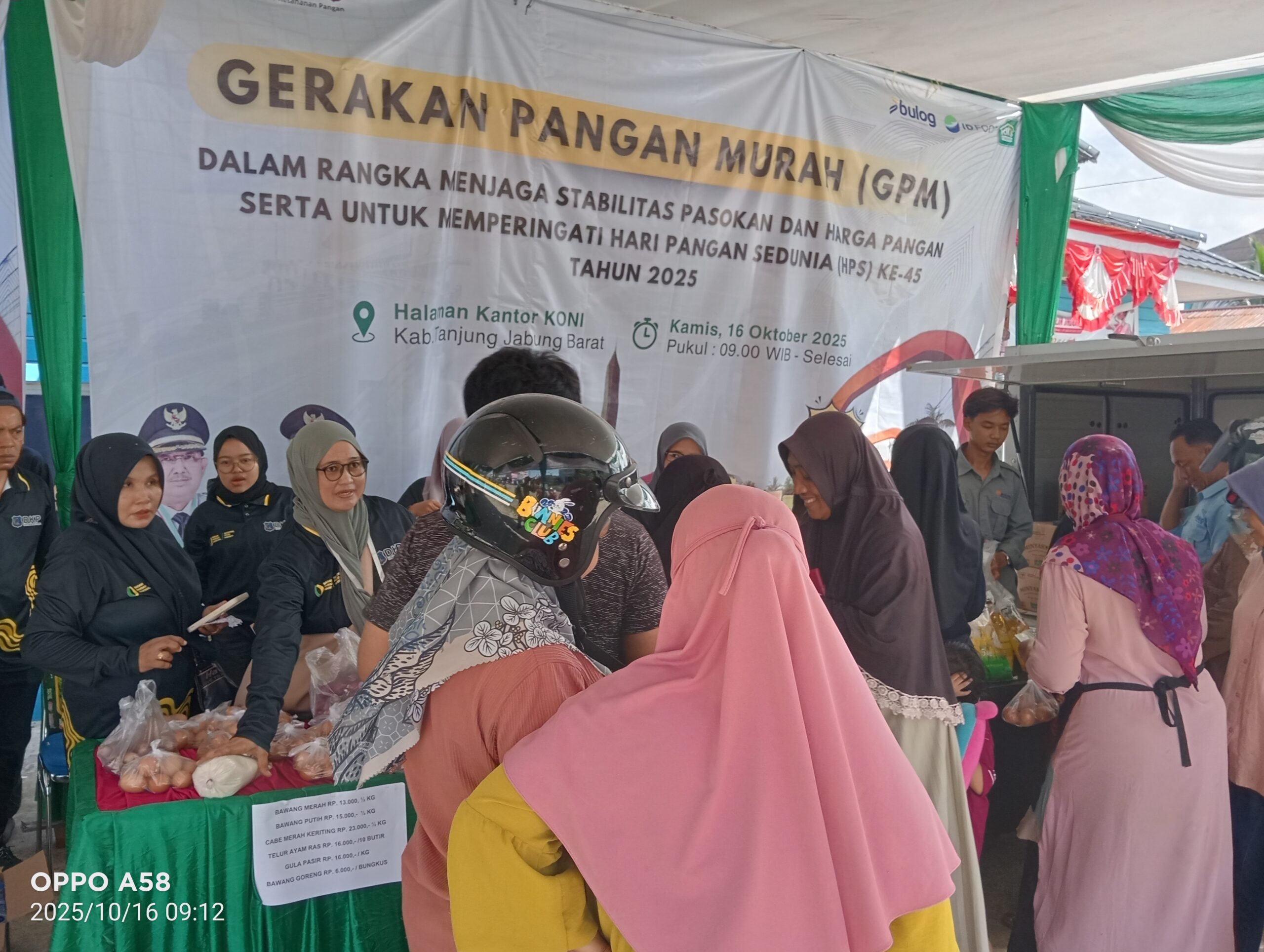 SEARAH.CO — Peringatan Hari Pangan Sedunia (HPS) ke-46 dan stabilitas pasokan harga pangan, Dinas Ketahanan Pangan (DKP) Kabupaten Tanjung Jabung Barat (Tanjabbar) menggelar pangan murah, Kamis (16/10/2025) di Halaman Kantor KONI Tanjabbar.
