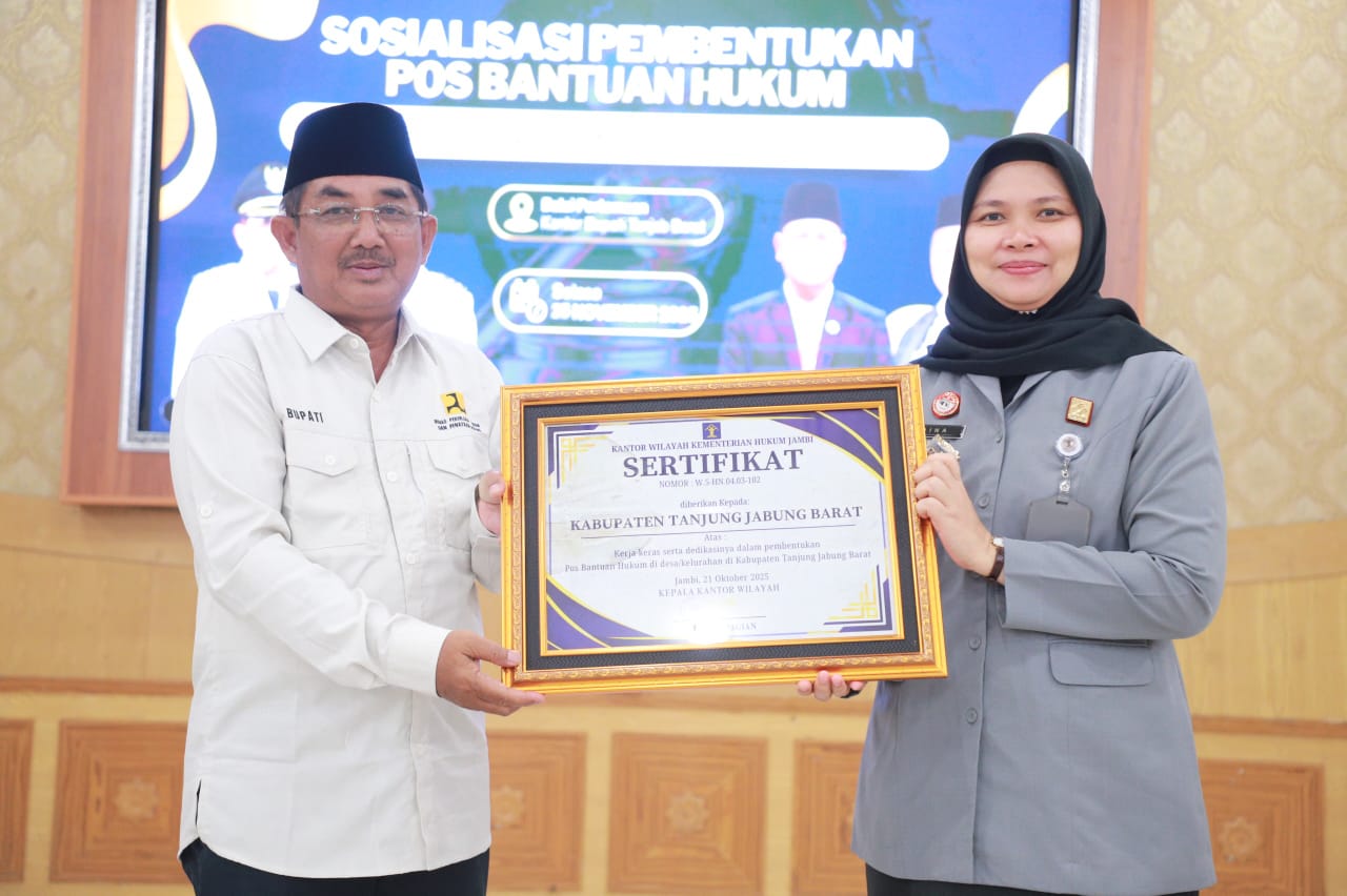 Sebagai bentuk penghargaan atas capaian tersebut, Kanwil Kemenkum jambi menyerahkan piagam apresiasi atas terbentuknya Posbankum di seluruh wilayah Kabupaten Tanjab Barat.