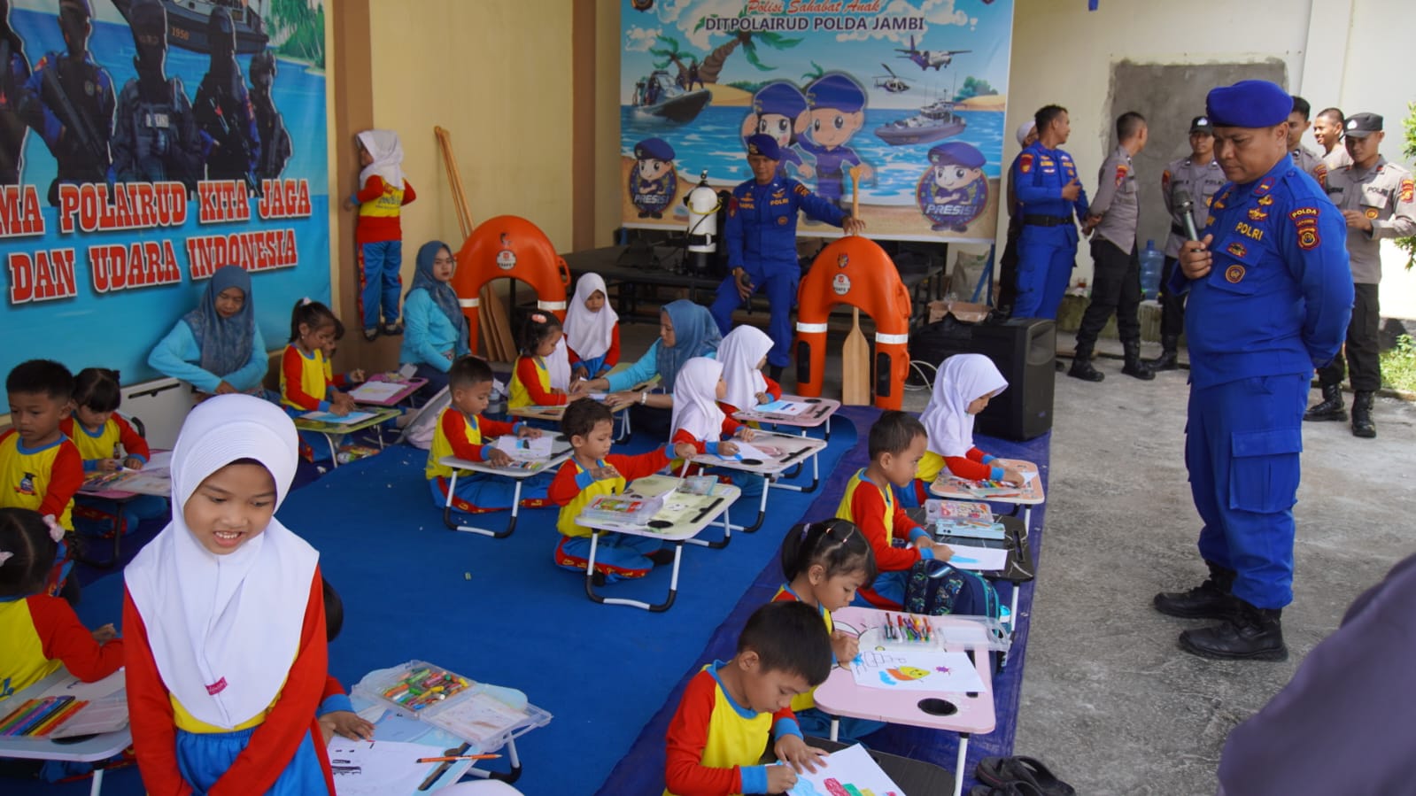 Hadir di sana menyapa para siswa TK Global Jambi, sejumlah personel Ditpolairud Polda Jambi.