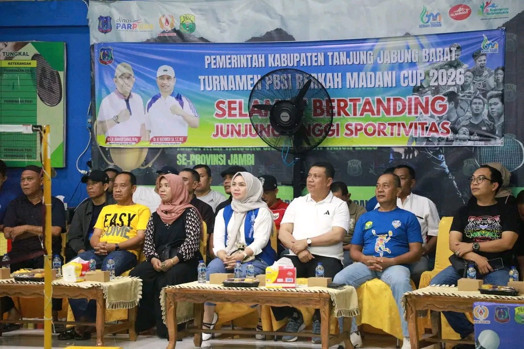 SEARAH.CO – Wakil Bupati Tanjung Jabung Barat, Dr. H. Katamso, SA, S.E., M.E., didampingi Ketua Gabungan Organisasi Wanita (GOW) Kabupaten Tanjung Jabung Barat Marina Septiani Katamso, S.IP., secara resmi menutup sekaligus menyerahkan piala kepada para juara Turnamen Bulutangkis Berkah Madani Cup Tahun 2026 yang digelar di GOR Bulutangkis Kuala Tungkal, Kamis malam (29/01).